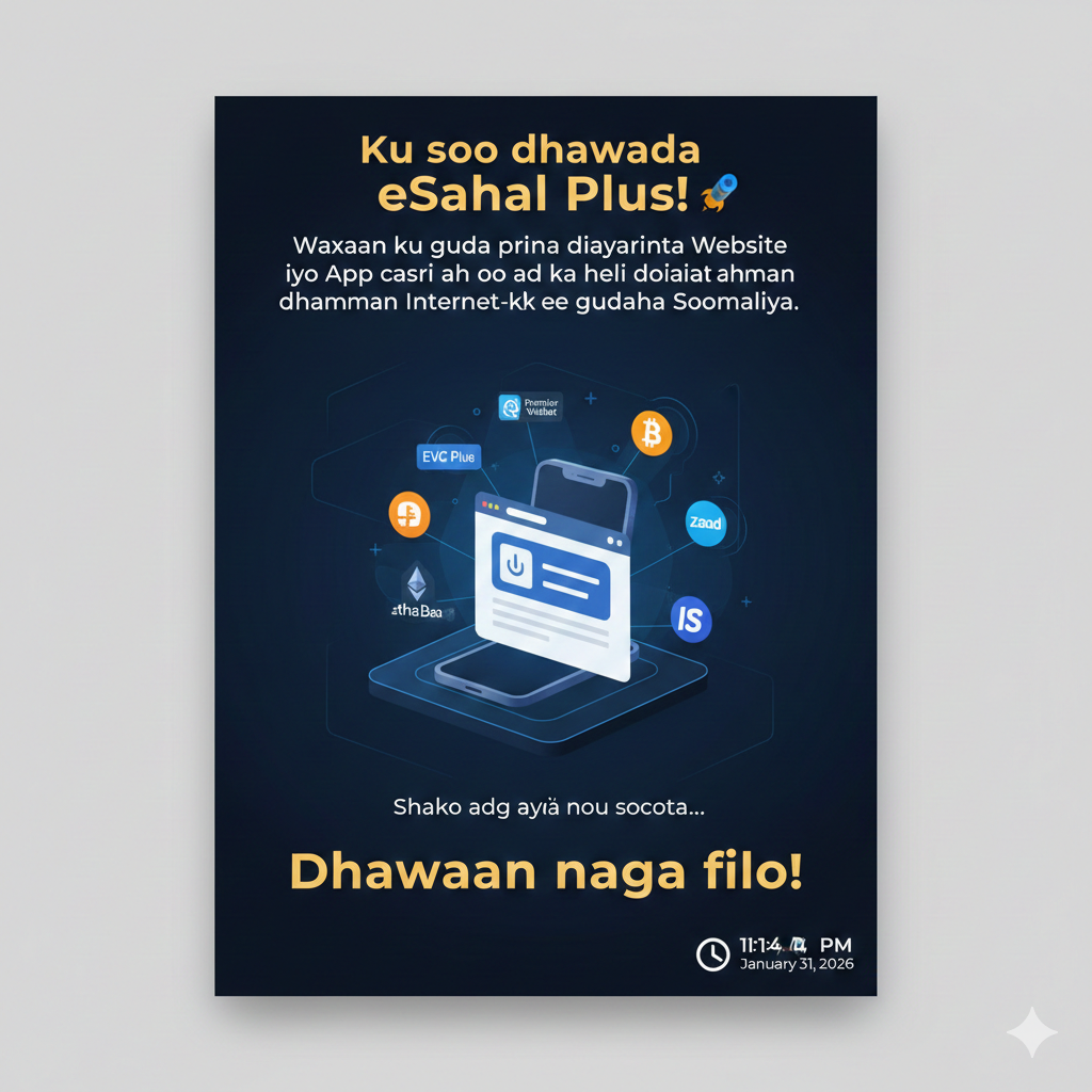 Ku soo dhawaada eSahal Plus! 🚀 Waxaan ku guda jirnaa diyaarinta Website iyo App casri ah oo aad ka heli doontaan dhammaan lacagaha Internet-ka ee gudaha Soomaaliya. Shaqo adag ayaa noo socota… Dhawaan naga filo!